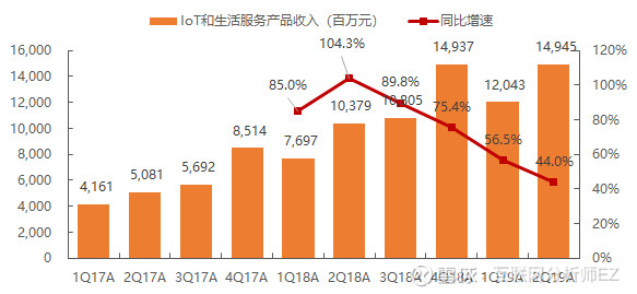 图:小米IoT与生活服务产品业务收入及同比增速(1Q17A-2Q19A)
