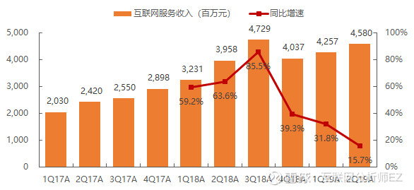 图:小米互联网服务及同比增速(1Q17A-2Q19A)