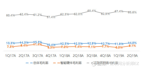 图:小米总体毛利率及分业务毛利率(1Q17A-2Q19A)