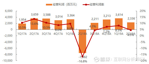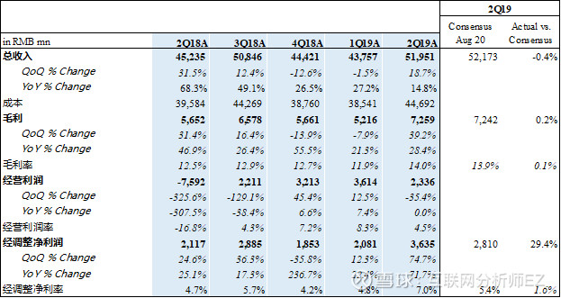 经营利润:2Q19为RMB23.4亿,环比减少35.4%;经营利润率环比下降3.8百分点至4.5%;