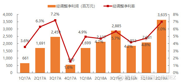 经调整净利润(Non-IFRS):2Q19为RMB36.4亿,同比增长71.7%,环比增长74.7%,超市场预期29.4%;经调整净利率为7.0%,同比提升2.3百分点,环比提升2.2百分点;