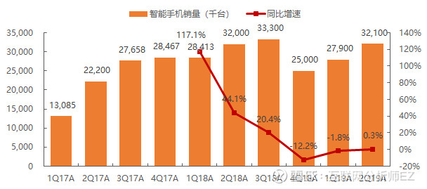 图:小米智能手机销量及同比增速(1Q17A-2Q19A)