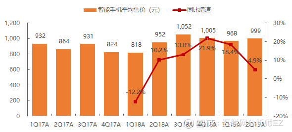 图:小米智能手机ASP及同比增速(1Q17A-2Q19A)