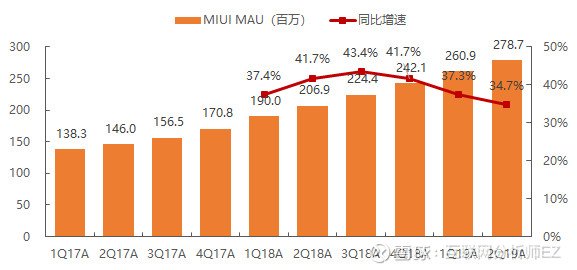 图:小米MIUI MAU及同比增速(1Q17A-2Q19A)