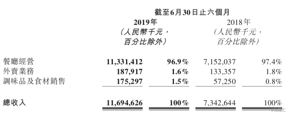 收入主要来自餐厅经营,占总收入的96.9%。从去年同期的71.52亿元,显著上升为113.31亿,增长了58.4%。主要由于2018年下半年及2019年上半年新开259间餐厅。