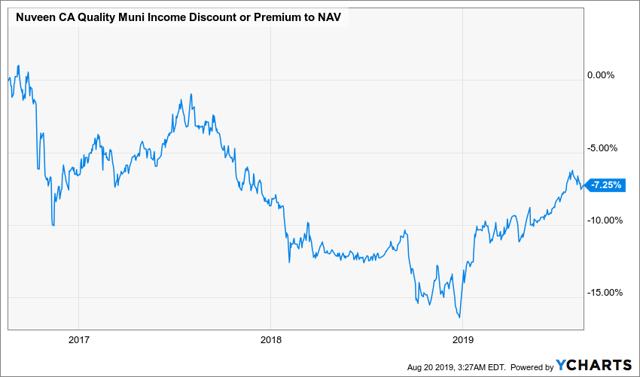 Chicago-based Nuveen is not as large or as preferred as Pimco for CEFs, yet several Nuveen funds have done very well for a very long time—and during times of inflows to CEFs (as in 2017 and this year), one can expect these discounts to shrink as investors return to the funds. So has been the case with Nuveen’s largest single-state muni bond fund, the Nuveen CA Municipal Income Fund (NAC):![]()