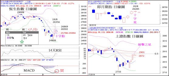 A股方面,上證指數在8月20日高見2891之後以「射擊之星」低收,其頂部剛好受制於3048至2733跌幅的0.5倍反彈目標2891。因此,「綠色星」也有條件促使上證指數在8月20日見頂。至於要確認短線見頂,上證指數必須先跌穿20天平均線支持低收,今日大概在2855。