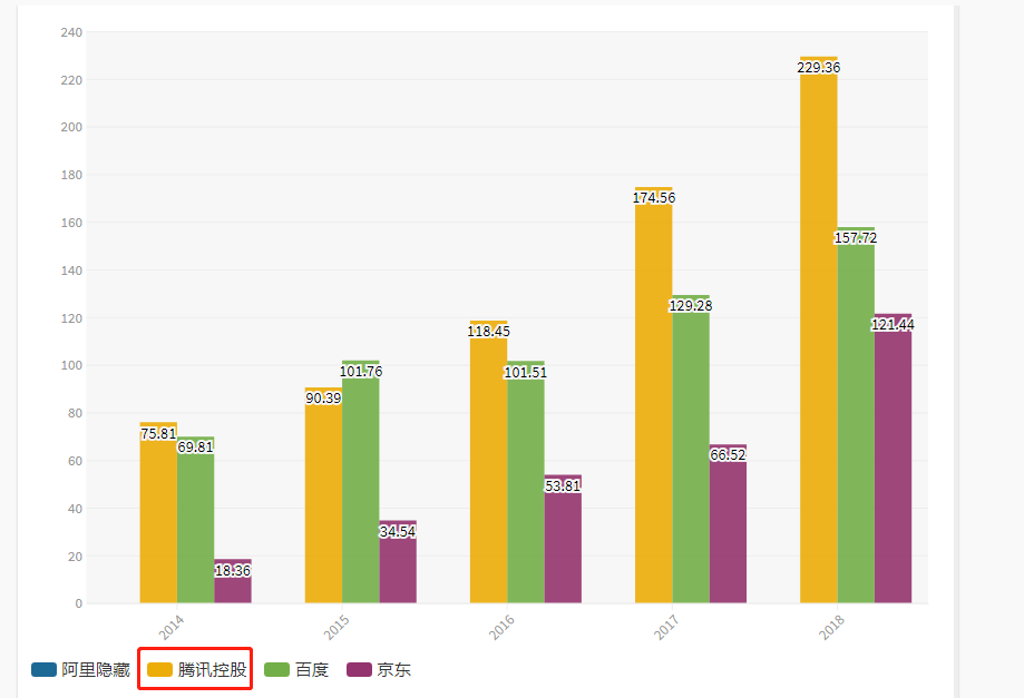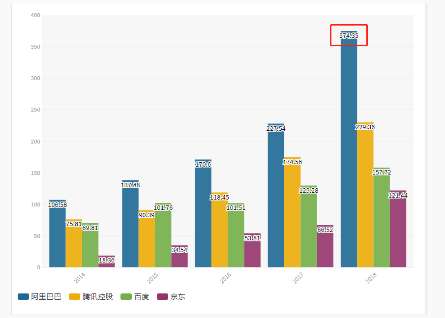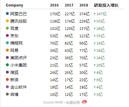最值得关注的焦点无疑是阿里巴巴。在2018年的研发投入高达374亿,较2017年增长了147亿。光研发费用的净增长便接近第三名百度2018全年的157亿。