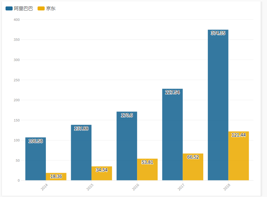 京东的占比排名相对靠后,就事实而言,造成占比差距明显的原因在于18年京东的总收入突破4620.19亿大关,大幅领先阿里的3768.44亿。