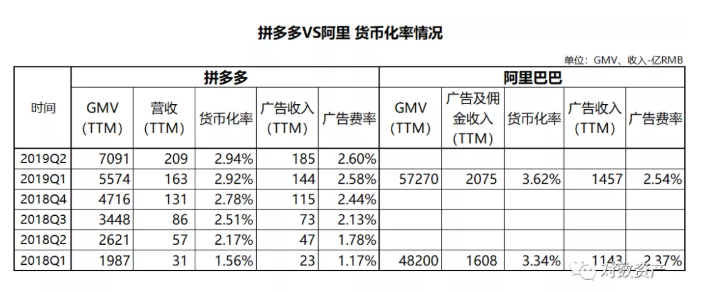 拼多多的货币化率和预期一致增速大幅趋缓,Q2为2.94%,整体与阿里还有些差距,但拆分来看Q1的广告费率就已经超过阿里,这是很难再快速提升的原因。佣金方面,拼多多目前只是替第三方代收。