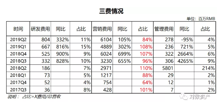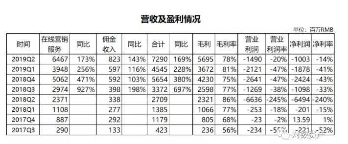 2019Q2营收同比增长169%至72.9亿RMB,净亏损10亿,净利率-14%较Q1有明显收窄,具体业务情况及分析详见下文。