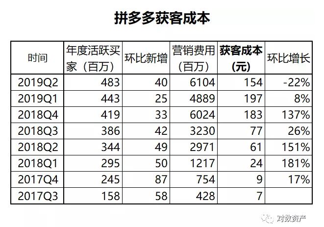 用营销费用/新增买家换算出获客成本,成本较Q1下降至154元/位,但此公式计算的结果是越来越失真的,以前买家基数小,绝大部分营销开支是用在增加用户上,但目前的体量就要分两部分,一是老用户的留存,二是新用户的增加,但财报并未具体披露,同样阿里也是,直接比较存在bug。