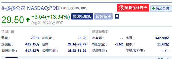 新浪科技讯 北京时间8月21日晚间消息,拼多多开盘大涨13.21%,报29.39美元。