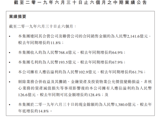 新浪港股讯 8月22日消息,融创中国(01918.HK)公布中期业绩,上半年本集团收入约为人民币768.4亿元,较去年同期增长约64.9%。集团连同其合营公司及联营公司的合同销售金额约为人民币2,141.6亿元,较去年同期增长约11.8%;本集团收入约为人民币768.4亿元,较去年同期增长约64.9%;本集团毛利约为人民币193.5亿元,较去年同期增长约67.9%;本公司拥有人应占溢利约为人民币102.9亿元,较去年同期增长约61.7%;剔除业务合并收益及其摊销,金融资产及投资物业公允价值变动损益,非核心业务的资产减值损失等事项影响后的本公司拥有人应占溢利约为人民币126.6亿元,较去年同期可比金额增长约128.4%;及本集团于二零一九年六月三十日的现金余额约为人民币1,380.0亿元,较去年年底增长约14.8%。