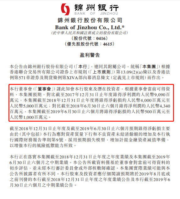 对于业绩原因,锦州银行在公告中指出,2018年及2019年上半年预期录得净亏损主要是由于为应对资产质量下行和不良资产未结清余额的增加,以及执行国际财务报告准则第9号(IFRS 9),采用了预期损失模型,增加计提金融资产减值准备,以增强自身的风险抵御能力所致。