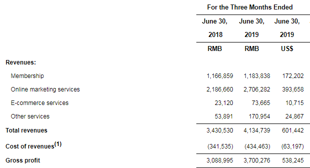 58同城于周三美股盘后公布了2019年第二季度财务报告。财报显示,公司第二季度营收41.35亿人民币,人民币同比增长20.5%,超过公司之前给出的41亿人民币的指引上限。主因公司各种在线营销服务的采用和有效性不断提高。二季度毛利润为37亿人民币,同比增长了19.8%,但仍然维持了89.5%的毛利率水平,去年同期为90%。