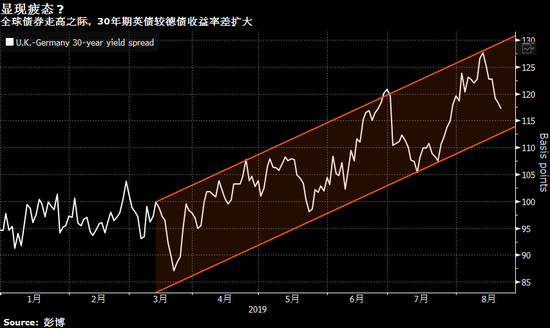 由于贸易局势紧张,令全球经济前景恶化,世界各地资本涌入政府债券寻求避险,基准英债收益率触及纪录低点,收益率曲线于上周出现倒挂。但是Dowding认为,由于英国政府有可能会加快债券发行、提高支出,以支撑受到脱欧影响的经济,英债市场可能很快开始掉队。