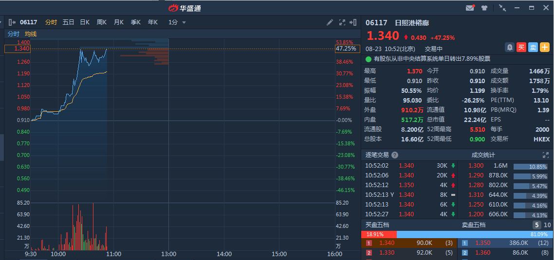 【财华社讯】日照港裕廊(06117-HK)截止10:53上涨47.25%,现报1.34港元,涨0.43港元。成交1466万股,涉资1758万港元。