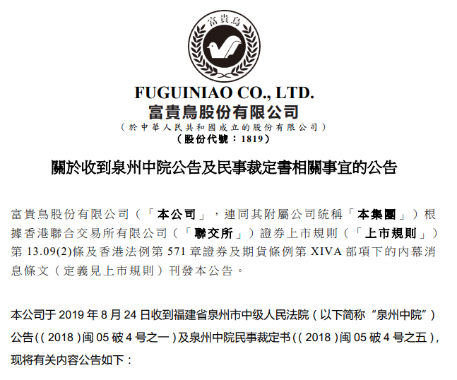 8月初,富贵鸟曾公告称,2019年8月9日,联交所向公司发出函件,告知公司股份的最后上市日期将为2019年8月23日,而股份上市地位将于2019年8月26日上午9时起取消。
