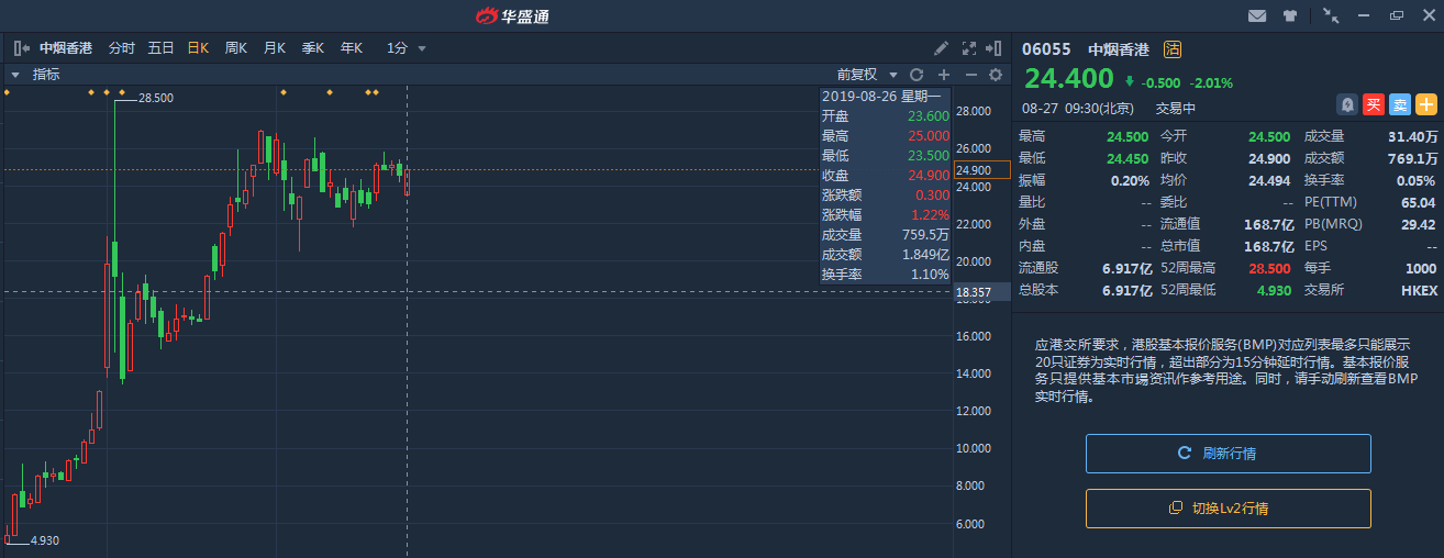在芸芸众股之中,今年能带上香港牛股之王的要数中烟香港了。中烟香港身披“上瘾第一股、独家经营”等外衣,其4.88港元的发行价,在半个月的时间就摸上了28.5港元的高位。但是随着股价的抬升,投资者也不禁陷入迷思,究竟这只“抽烟股”超60倍的市盈率能维持下去吗?我们先来看看其2019年半年的财报