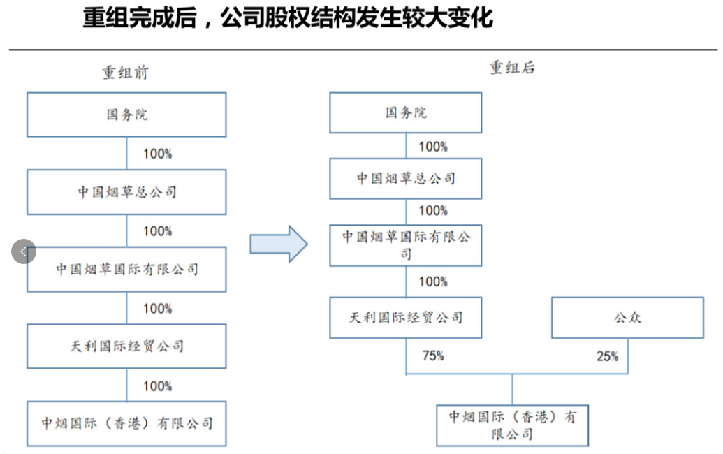 在2018年中烟香港重组前,公司并无经营任何实质性业务,而是中国烟草总公司透过23家子公司从事烟草出口工作。2018年3月,中国烟草总公司为建立国际资本市场运作平台及拓展海外市场,出台印发了60号文,指定中烟国际为中国烟草行业的国际业务拓展平台及相关业务独家营运实体,其余子公司不得继续从事相关业务,中烟国际开始享受政策、渠道、市场等天然优势。