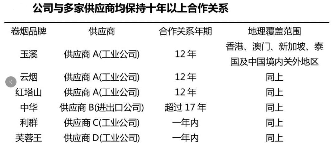 比如中烟香港是巴西、美国、阿根廷、加拿大、赞比亚、多米尼加共和国、坦桑尼亚、马拉维等国家进口烟叶类产品至中国的唯一供应商,这些海外供应商并无其他进入中国市场的渠道,必须与公司保持合作关系。