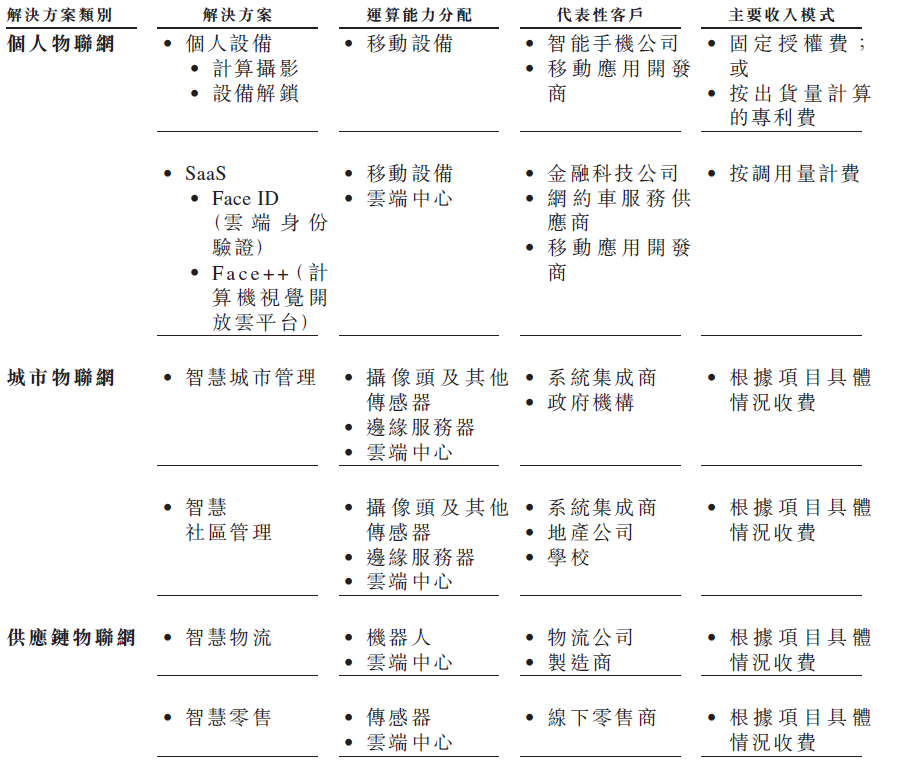 公司核心技术从人脸识别平台升级为系统化AI算法引擎,业务已从人脸识别拓展到城市物联网和供应链物联网领域:个人物联网包括Face ID及Face++开放平台等其他SaaS解決方案以及智能手机等个人设备解决方案,占比逐渐下滑;经过转型城市物联网业务占比逐渐提升,主要面向政府(城市管理)和企业(智能社区管理);供应链物联网为新拓展业务,包括智慧物流解決方案和智慧零售解決方案。2019年上半年,三者收入占比分别为21.8%、73.2%及5%。