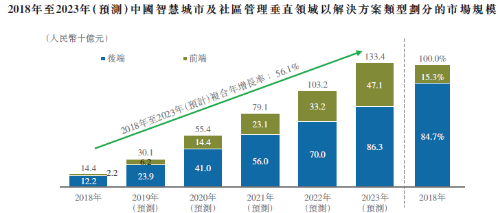 公司目前收入占比最高的为城市物联网业务,随着计算机视觉方案对传统方案的贴袋,报告显示,国内智慧城市及社区管理垂直领域的市场规模预计从2018年的人民币144亿元增至2023年的1334亿元,复合年增长率达到56.1%。目前,抛开非人工智能技术为主的公司,公司为该领域内最大的 以人工智能技术为主的供应商,市占从2017年的2.4%提至2018年的7.4%,排名第一。