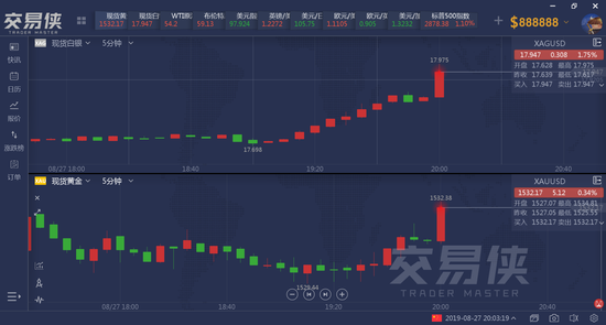 周二晚,白银价格突然短线拉升,国际白银涨幅一度扩大至1.8%,达17.96美元/盎司,刷新两年高位 ;白银期货2019年12月合约短线拉升至18美元/盎司,日内涨1.18%;上金所白银T+D涨幅扩大至2%。 黄金价格涨幅较小,日内涨幅为0.34%,仍在1530上方波动。国际白银8月迄今为止已涨逾10%(7月收盘16.176美元/盎司,目前报17.975美元/盎司) 。