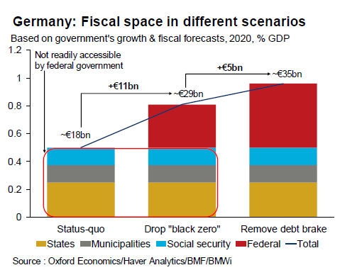牛津经济研究院首席德国经济学家哈克(Oliver Racau)则指出,让德国放弃两个重要的财政限制很难,这两个限制是被写入德国基本法(其法律效力等同于宪法)的“债务刹车”和有“黑零”之称的德国财政收支平衡原则。