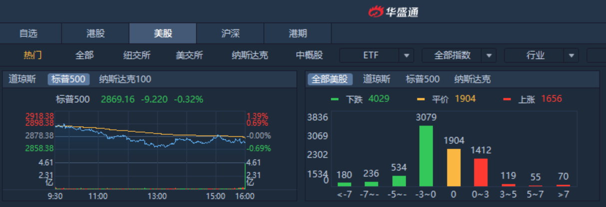 美股周二冲高回落,三大股指收盘全线下挫,道指跌超百点,因关键的2年和10年期美债收益率倒挂。截至收盘,道指跌0.47%,报25777.90点;标普500跌0.32%,报2869.16点;纳指跌0.34%,报7826.95点。