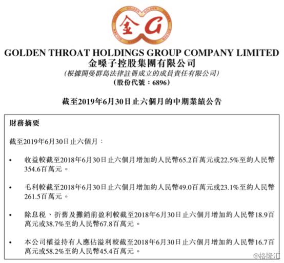 昨日晚间,金嗓子(06896.HK)发布了其截至2019年6月30日止6个月的业绩公告。整体而言,从财务摘要来看,金嗓子于今年上半年的业绩表现是不错的,延续了2018年的上扬之势。