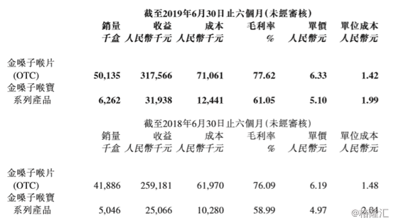 分产品来看,期内金嗓子喉片的销量达5013.5万盒,收益为3.18亿元,同比增长22.5%,约占收益总额的89.6%,主要由于金噪子喉片全国渠道重塑进一步完善,公司两票制渠道优化成效。而金嗓子喉片的销售额增加,也是致使公司总收益增加的主要原因。