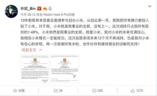 对此,为了稳定投资者情绪,8月27日,雷军签署并发布公告称,执行董事、总裁林斌自愿承诺自己及其控制的实体在365天内不会出售公司股份。同日,林斌个人也在微博上晒出关于本次承诺的函件和公告。他表示,小米依然是我事业的全部。我爱小米,我对小米的未来充满信心,我相信小米模式一定能成功。