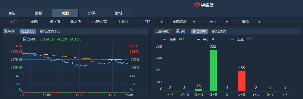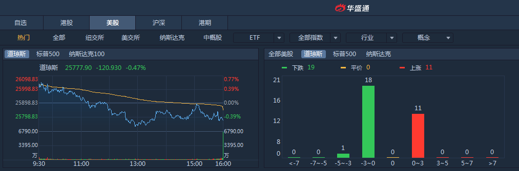 美股周二冲高回落,三大股指收盘全线下挫,道指跌超百点。截至收盘,道指跌0.47%,报25777.90点;标普500跌0.32%,报2869.16点;纳指跌0.34%,报7826.95点。