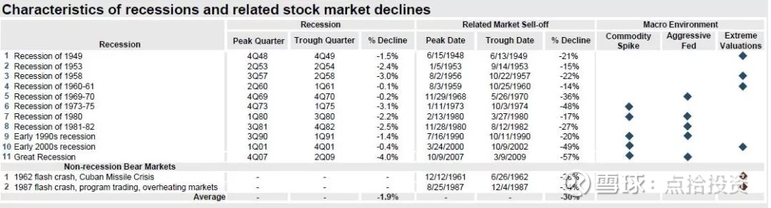 我们看到在这篇报告中,熊市触发有四大因素:经济衰退、通胀、美联储收紧、估值过高。其中股市走熊的主要因素是经济衰退。我们看到二战之后,美国经济真正的衰退一共11次。其中大部分集中在80年代前,特别是二战后到1961年中,出现了4次衰退。进入80年代后,除了2008年金融危机,都是一些小的衰退。包括80年代初原油危机带来的衰退,90年代初也是伊拉克入侵科威特带来的小衰退。从持续的时间看,二战后美国经济衰退时间超过1年的只有两次:分别是1973到1975年滞涨,和2007到2009年金融危机。