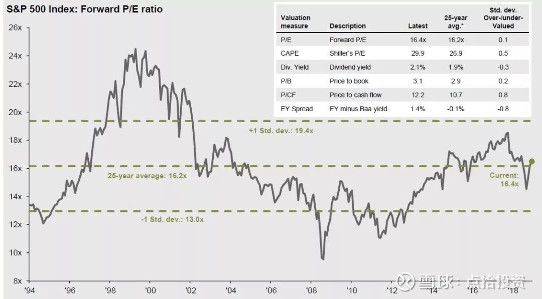 下面是截止到2019年二季度标普500的估值水平,目前为16.4倍,处于历史平均水平。那么估值贵吗?显然并没有。