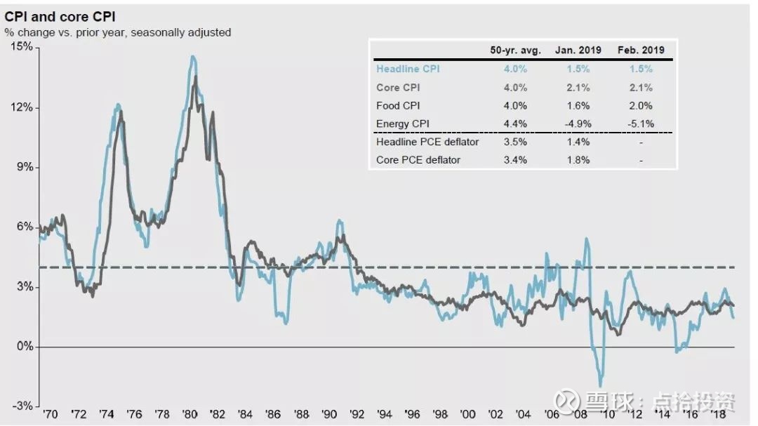 通胀处于什么水平呢?截止2019年2月份,核心通胀水平为2.1%,大幅低于过去50年历史平均4%的通胀水平。
