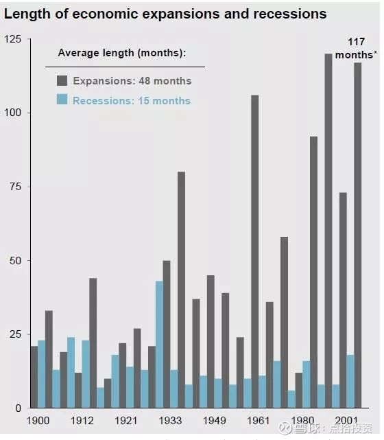 所以从触发熊市的四个因素看,我们基本上可以排除估值、美联储收紧、通胀三大因素带来的股市调整。现在的不确定性来自经济是否衰退。我们看下面这张图,截止2019年二季度,美国经济已经扩张了117个月,几乎扩张了10年了。很快就会成为美国历史上经济扩张最长久的一个周期。从“钟摆理论”出发,经济无法永远扩张下去。美国经济平均扩张周期是48个月。