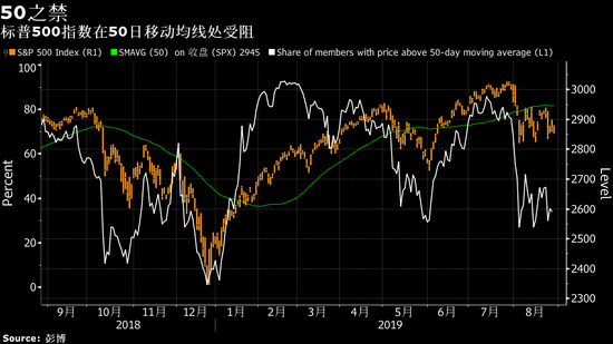 新浪美股8月29日讯,这些天对标普500指数而言50可能是一个不吉利的数字。美国股票基准指数整个8月都在其50日移动均线约2950点受阻,高于该标志的成份股比例仅徘徊在27%左右,为今年来的最低水平。