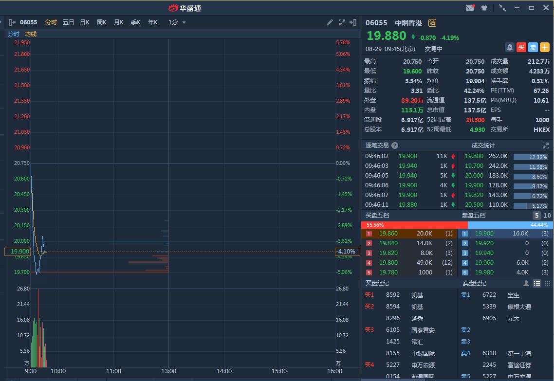 智通财经APP获悉,中烟香港(06055)于本周一发布半年报,净利润1.3亿港元,同比减少30.5%。股价已连续三日下挫,昨日收跌超10%。截至发稿,跌4.19%,报19.88港元,成交额4233万港元。