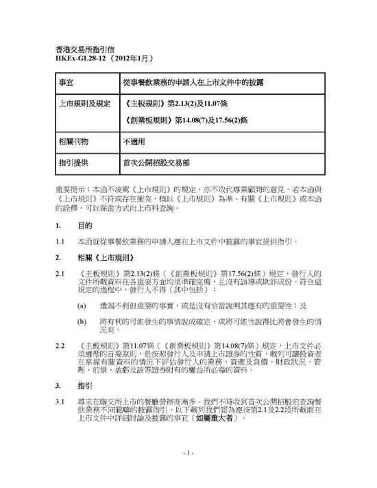 港交所发布的这份指引是于2012年1月发布,是为包括就从事餐饮业务的申请人应在上市文件中披露的事宜提供指引,对欲在港IPO的餐饮企业披露文件提出了七大要求,包括:供货商、 食材来源及其价格、同店销售额及桌/座流转率、现金管理、商标、扩充、定价政策及食品安全质量监控及投诉。详情如下: