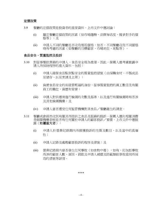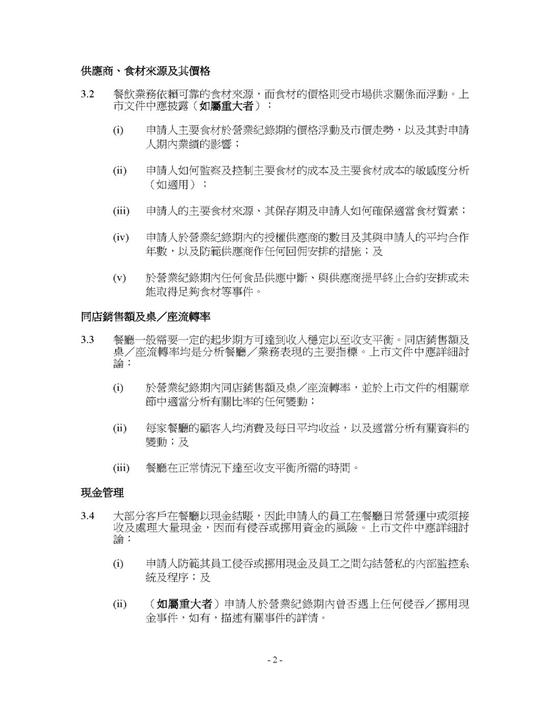 2. 餐厅或会偶然收到有关其所提供之食品及服务的投诉。保荐人应向相关消费者保障机构查核是否有任何关于申请人的顾客投诉/索偿。上市文件中应披露(如属重大者):