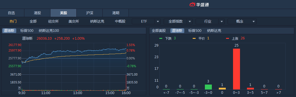 美股周三低开高走,三大基准股指收盘全线上扬,道指涨超250点。截至收盘,道指涨1.00%,报26036.10点;标普500涨0.65%,报2887.94点;纳指涨0.38%,报7856.88点。