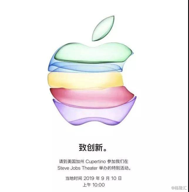 这次邀请函的主题是“致创新”,海报设计图案为五彩的苹果logo,其中绿色与紫色极有可能就是今年iPhone 11(推测名)新增的两个配色。
