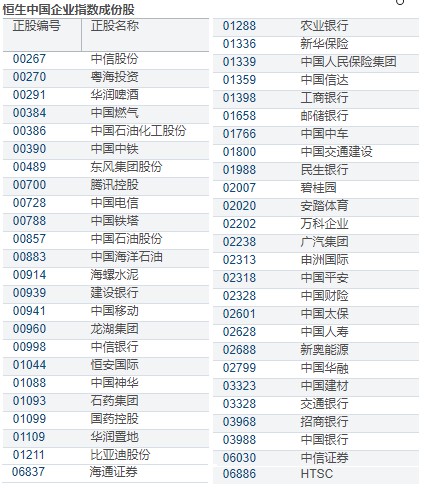 恒生国企是包含AH企业最多的一个指数,其成分股如下: