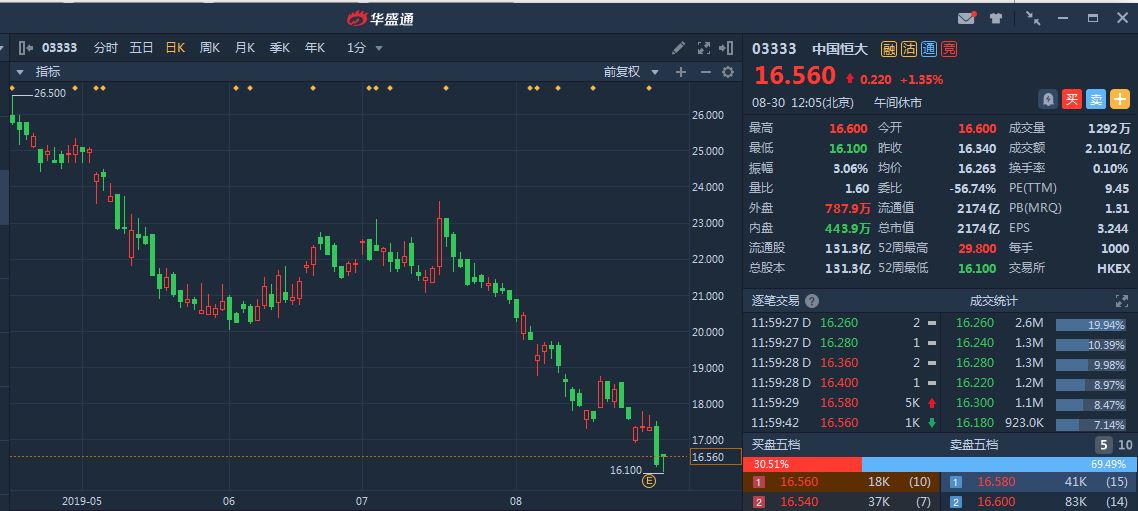 然而随着三四线房价的大涨,居民的家庭负债率持续上升,监管层也秉着“房住不炒”的方针出动了多重组合拳。大涨后的一年多过去,恒大交出了一份盈利大幅下跌的成绩单,股价在8月29日跌至16.34港元,到30日早盘跌幅缩窄0.98%,但仍创下两年以来新低。究竟恒大在房地产政策愈加严格的趋势下,现在会是股价下跌的开始吗?