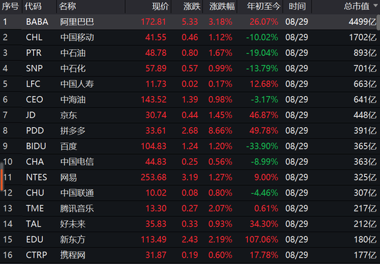 新浪港股讯 8月30日消息,隔夜美股大涨,中概股自然也不落人后,互联网公司中,阿里大涨逾3%,京东涨1.45%,百度涨1.2%,网易涨1.3%,腾讯音乐涨2%,而拼多多则暴涨8.66%,今年以来涨幅高达50%,市值净增近200亿美元,市值直逼400亿美元,一举超越百度成为中国第五大互联网公司。