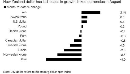 纽元是8月份表现最差的G10货币,因该国经济数据恶化,且贸易紧张局势令全球不安。 周五纽元兑美元下跌0.3%至0.6291美元,周线大跌1.6%,创下2015年9月以来的最低水平。