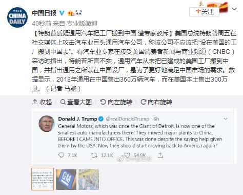 [特朗普质疑通用汽车把工厂搬到中国 遭专家驳斥]美国总统特朗普周五在社交媒体上攻击汽车业巨头通用汽车公司,称该公司不应该把“设在美国的工厂搬到中国去”。有汽车业专家在接受美国消费者新闻与商业频道(CNBC)采访时指出,特朗普所言不实,通用汽车从未把已建成的美国工厂搬到中国,并指出通用之所以在中国设厂,是为了更好地满足中国市场的需求。数据显示,2018年通用在中国售出360万辆汽车,而在美国本土售出300万辆。(记者 马驰)